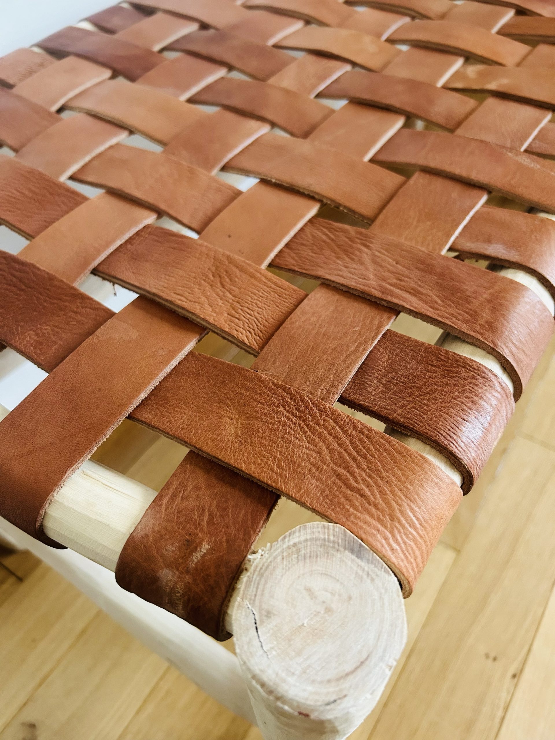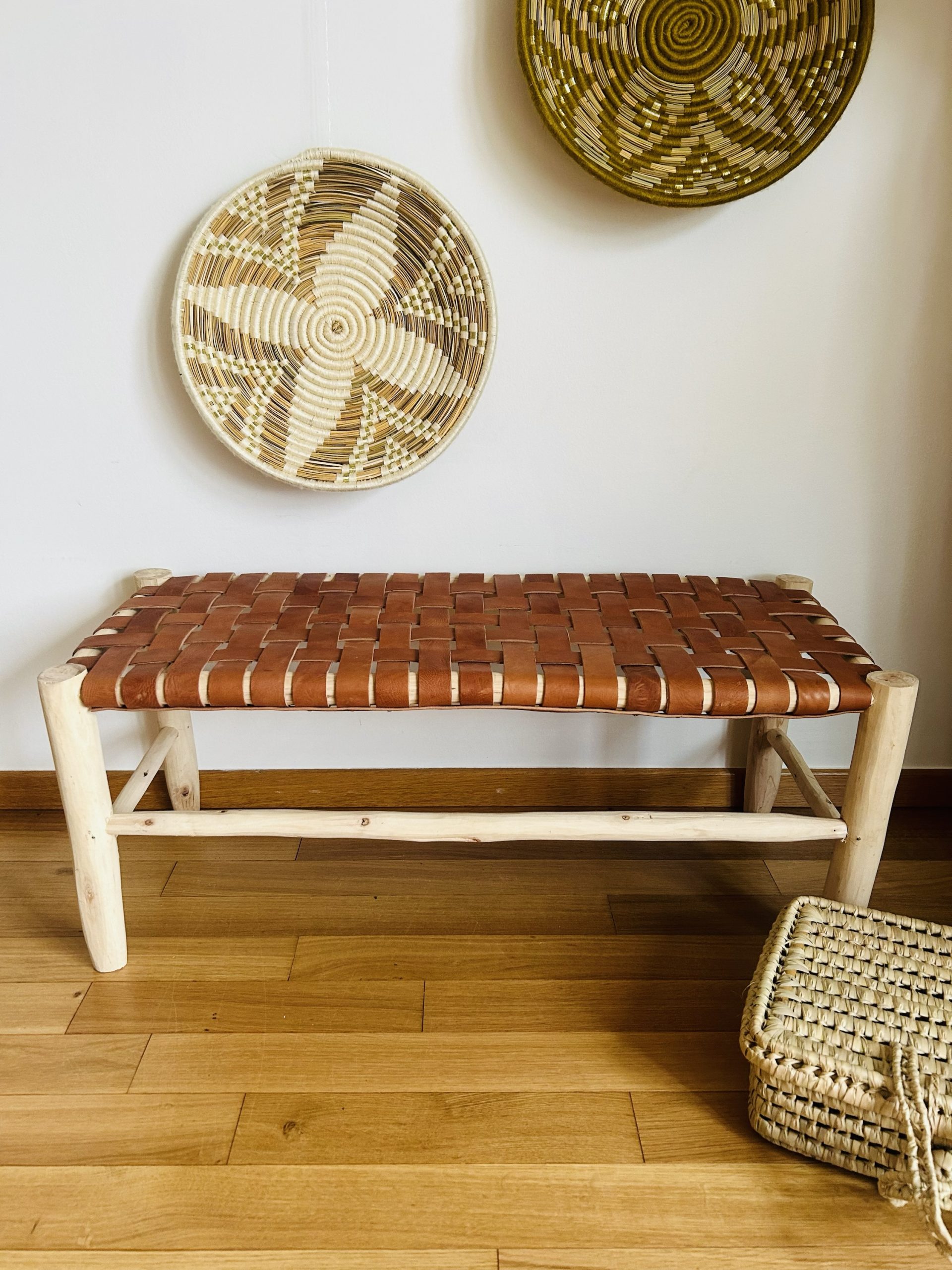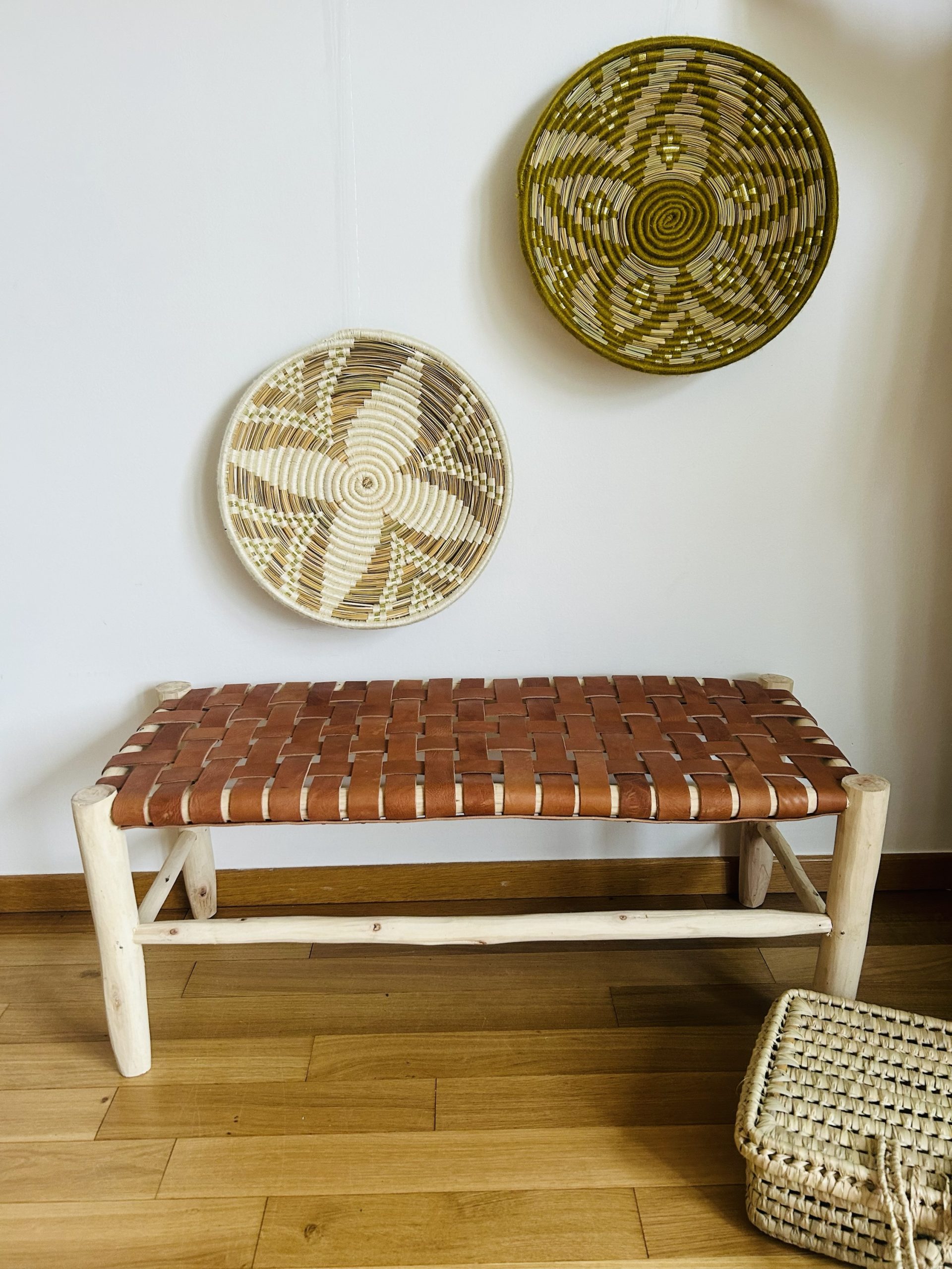 Ce banc en cuir marocain signe le retour de la déco à l’état brut. Pour s’asseoir, pour décorer ou bien au pied du lit, sa structure en bois naturel, son tissage en feuille de palmiers tressées et sa robustesse apportent un aspect chaleureux à votre intérieur : un air du Maroc chez vous.