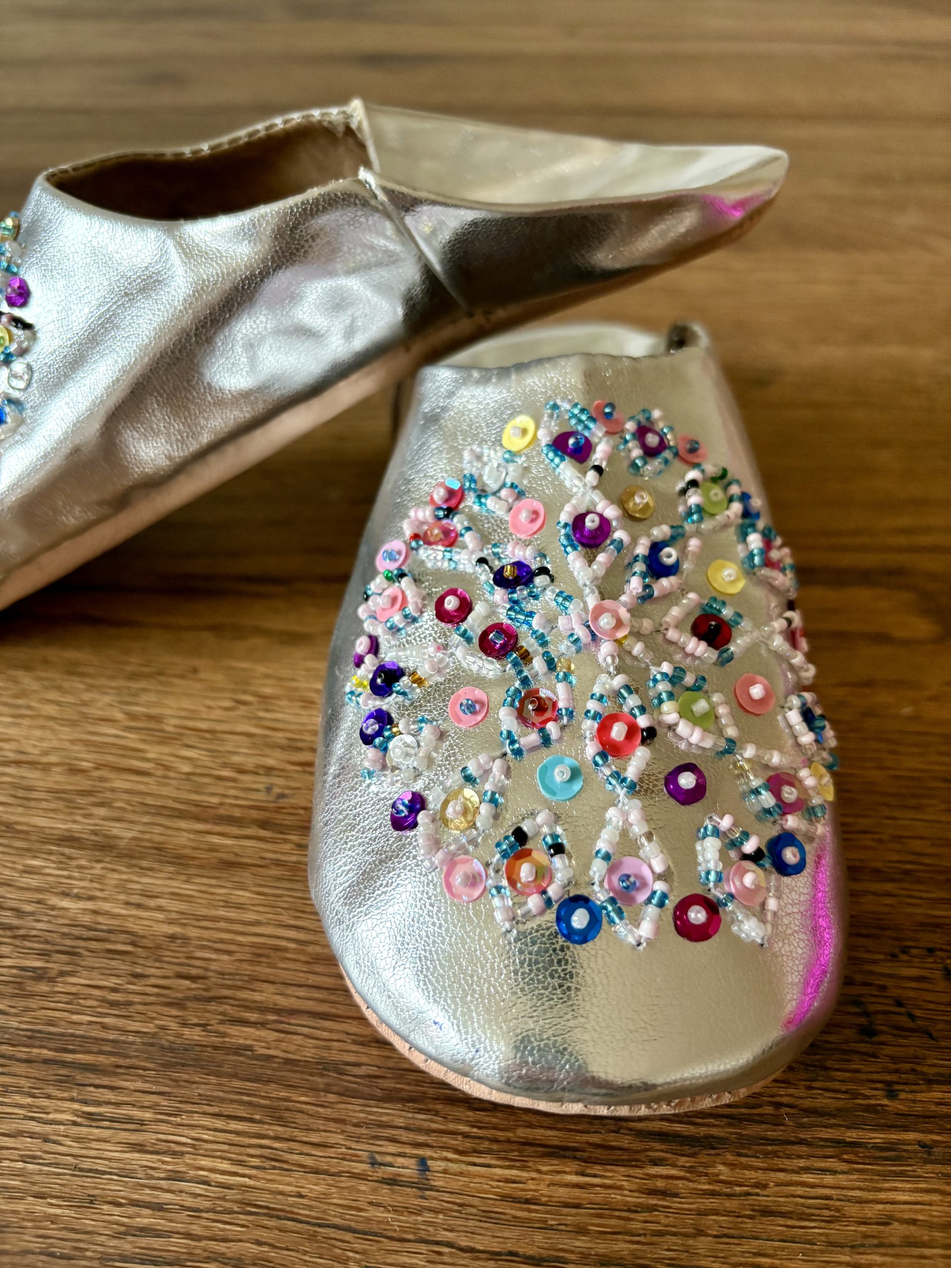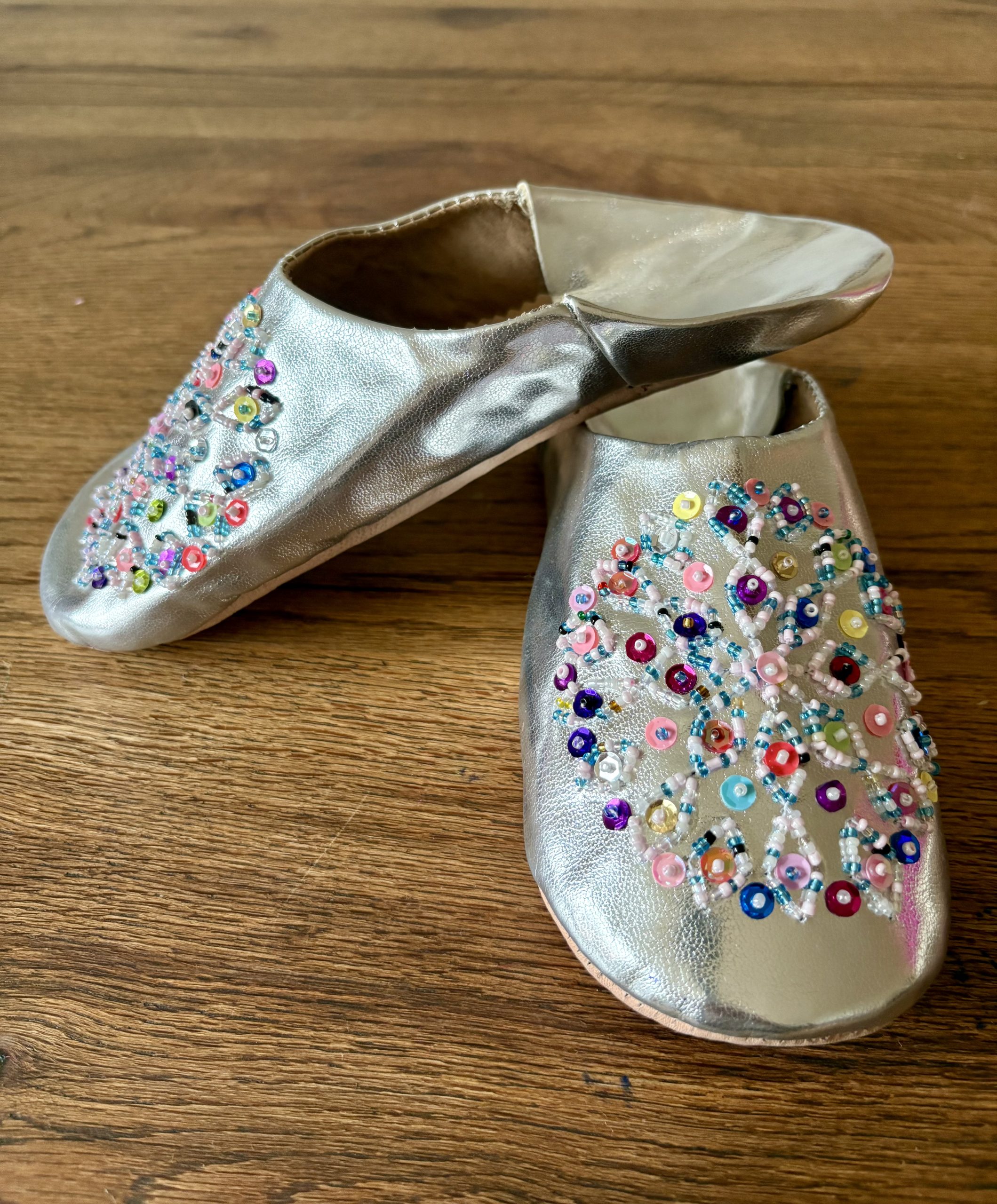 Chausson marocain femme en cuir argenté à perles