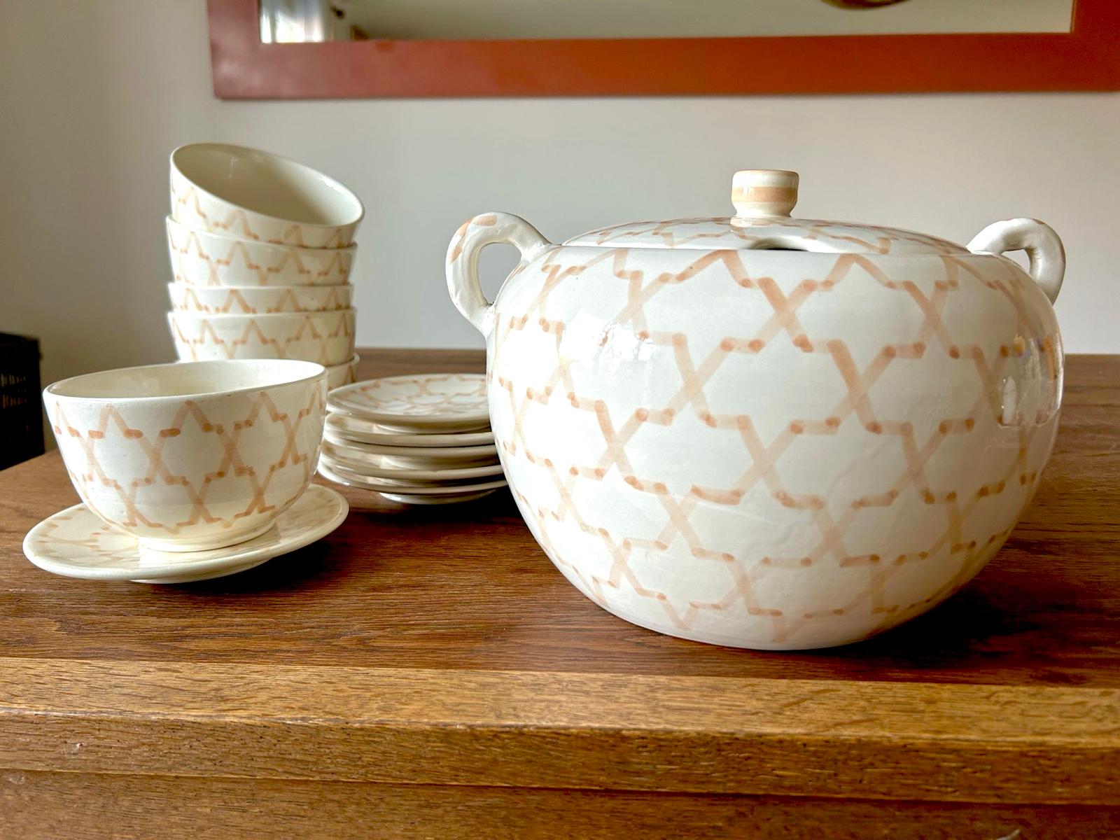 ENSEMBLE SOUPIÈRE ET BOLS BLANC À MOTIFS BEIGE EN CÉRAMIQUE