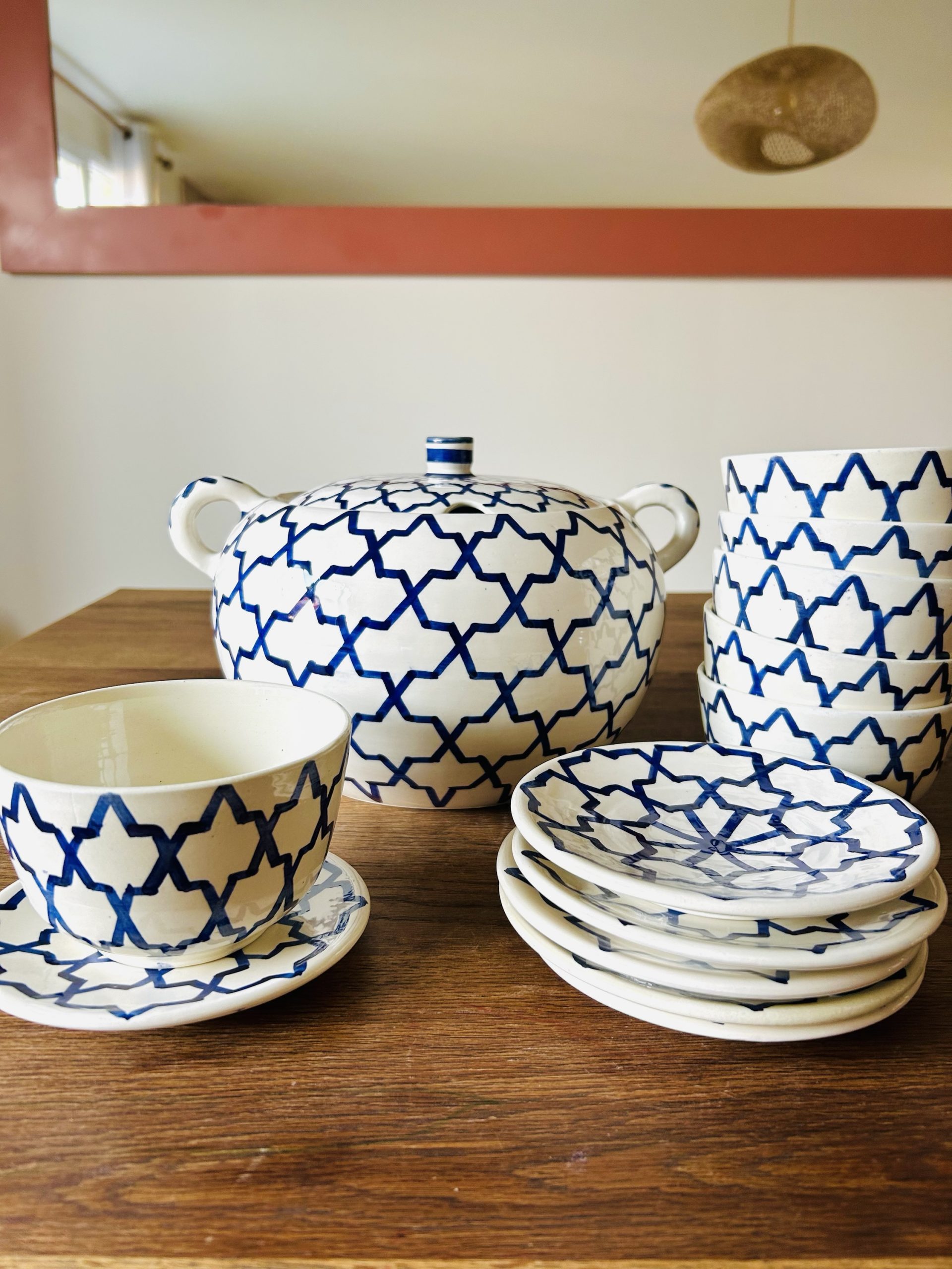 ENSEMBLE SOUPIÈRE ET BOLS BLANC À MOTIFS BLEU EN CÉRAMIQUE