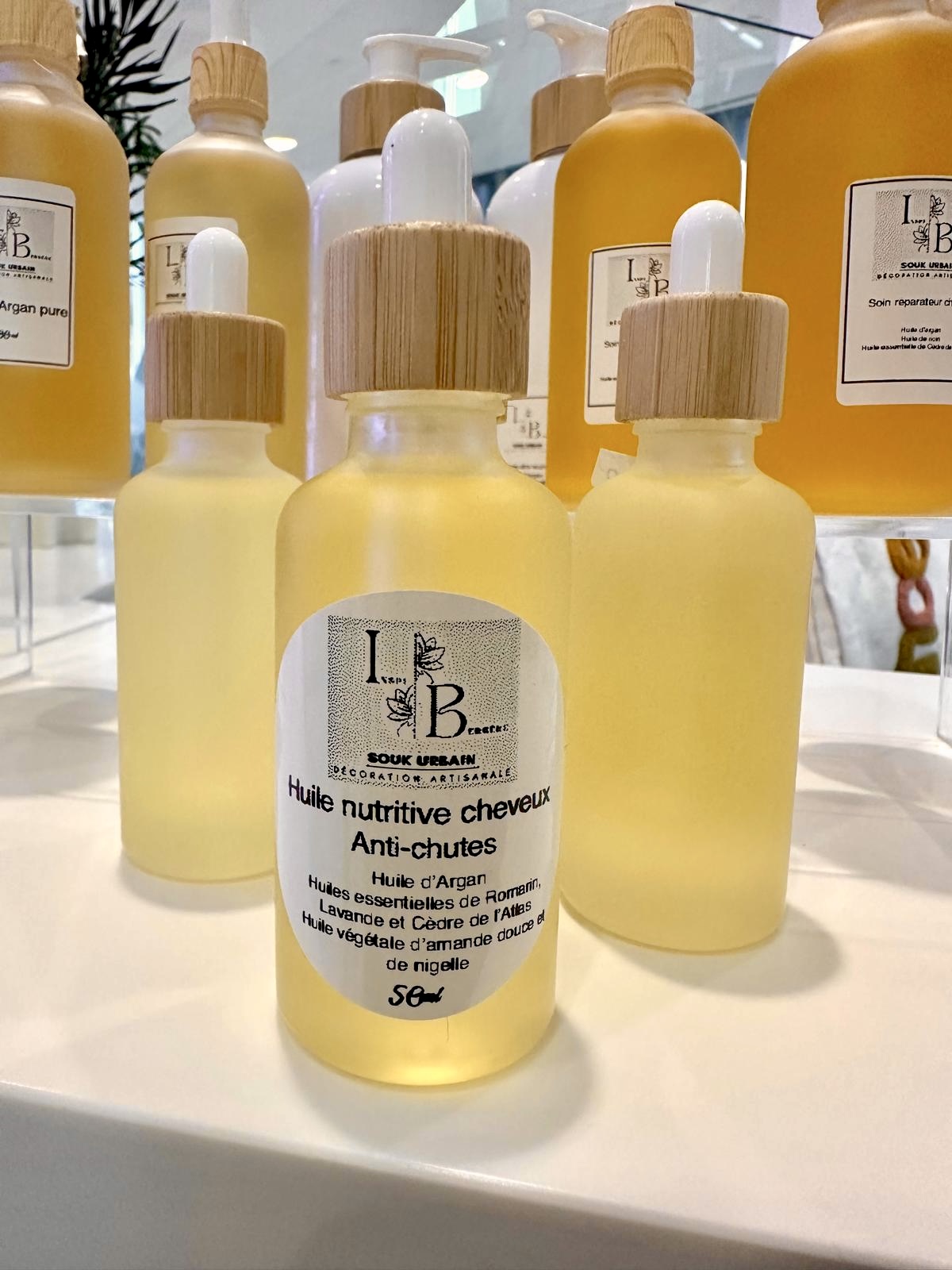 Ce soin associe l’huile d’argan, les huiles essentielles de romarin, lavande et cèdre de l’Atlas, ainsi que les huiles végétales d’amande douce et de nigelle. Ensemble, elles créent une synergie puissante qui agit en profondeur sur le cuir chevelu et la fibre capillaire.