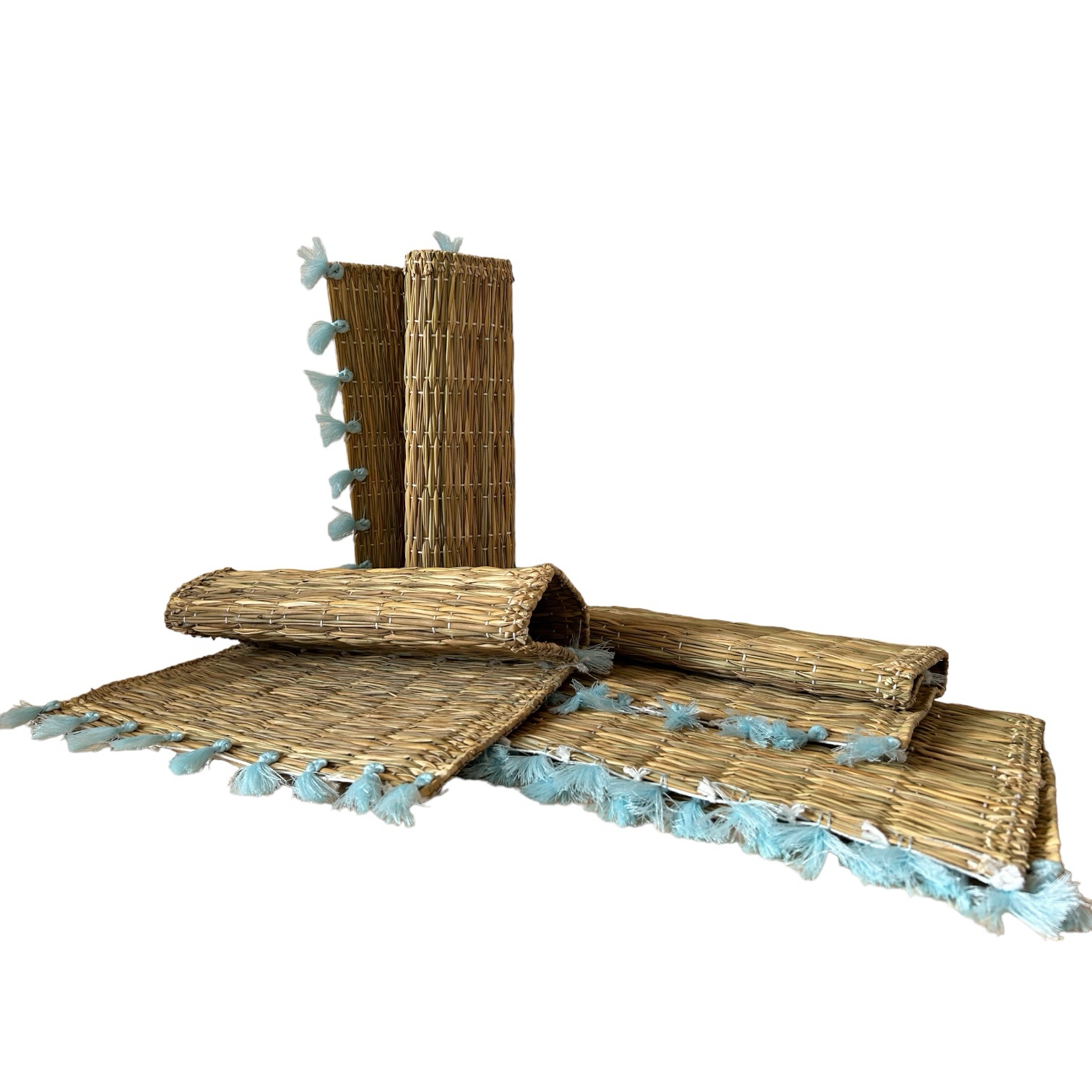 LOT DE 6 SETS DE TABLE À POMPONS BLEU CLAIR MODÈLE ASILAH