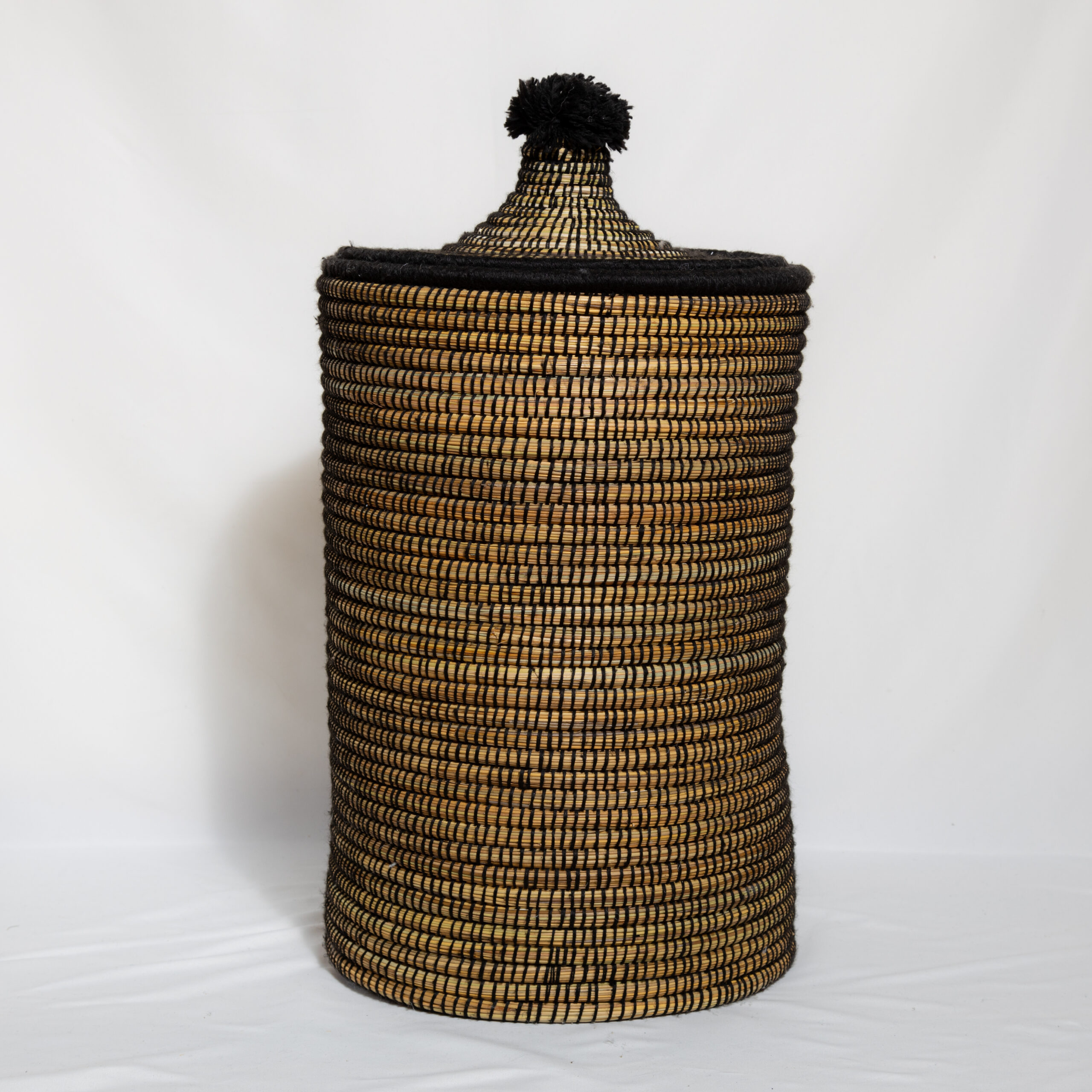 PANIER DE RANGEMENT MAROCAIN PAILLE ET LAINE NOIR RONDE 60CM