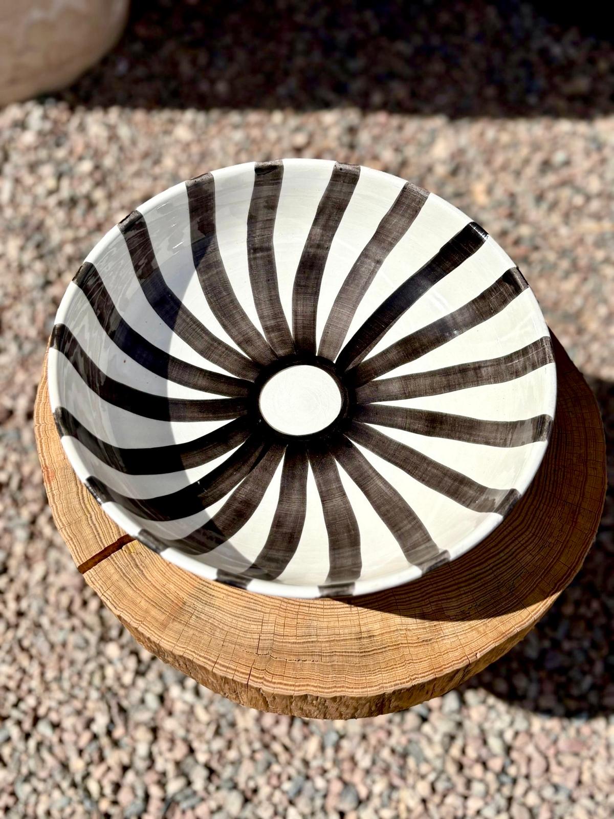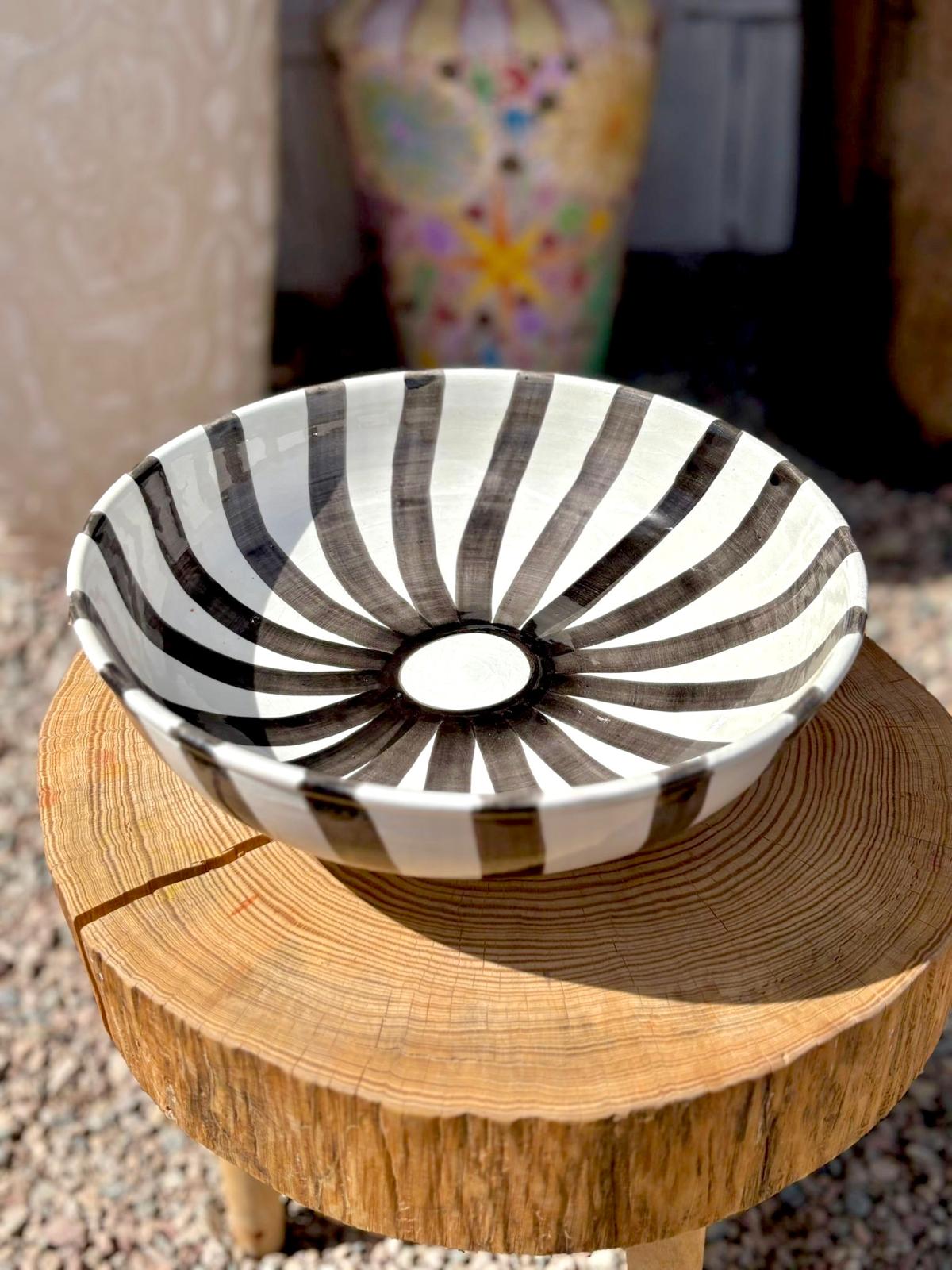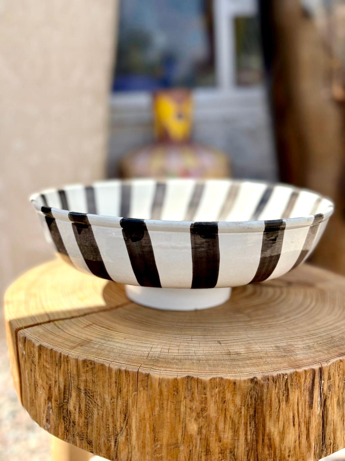 PLAT SALADIER ROND BLANC RAYÉ NOIR FAIT MAIN