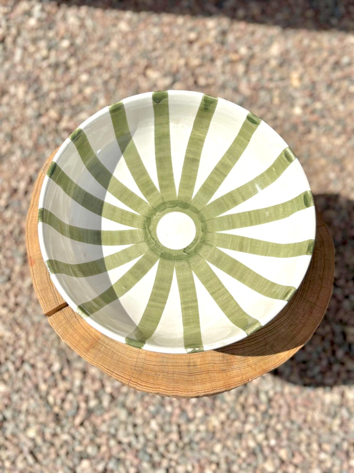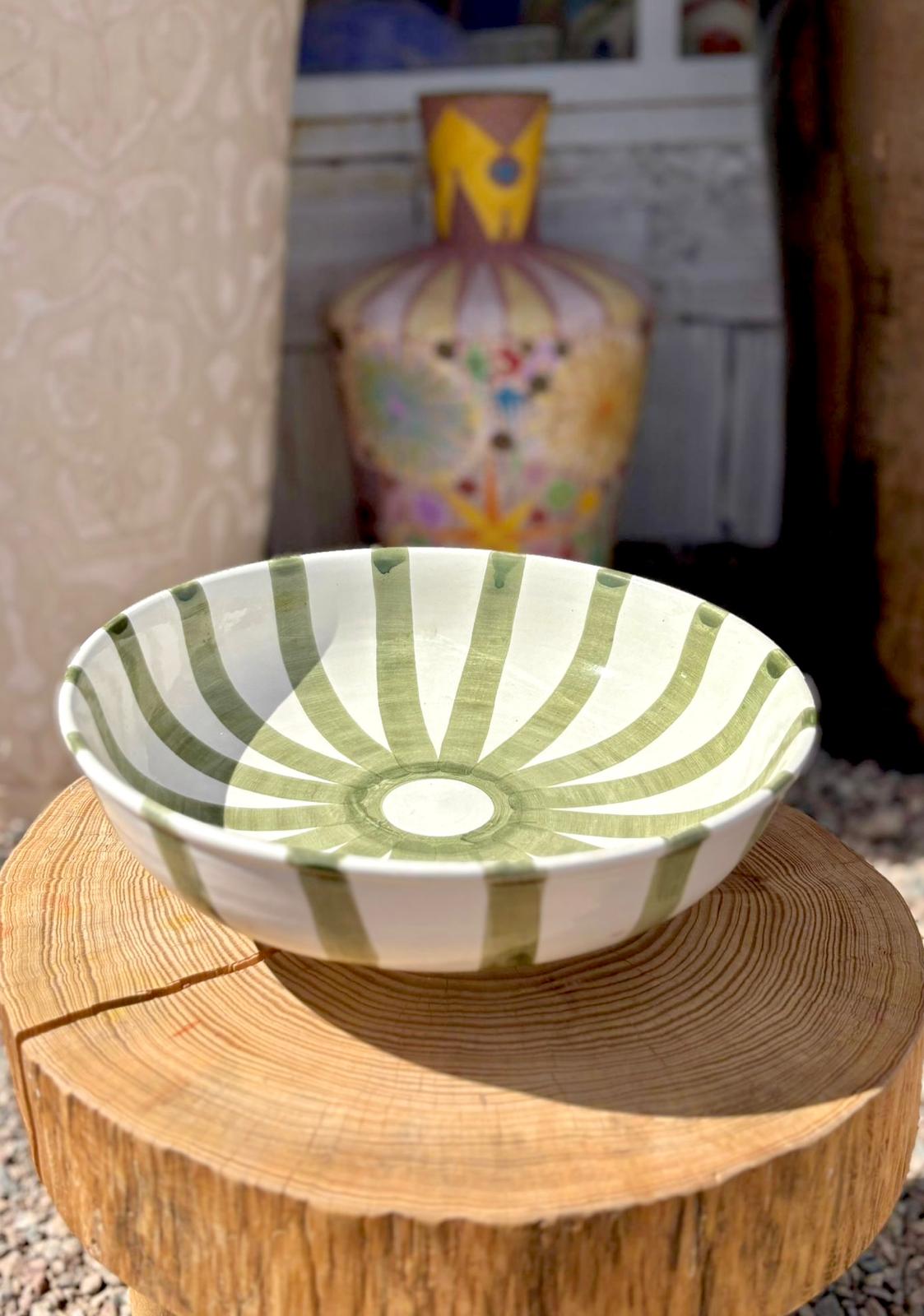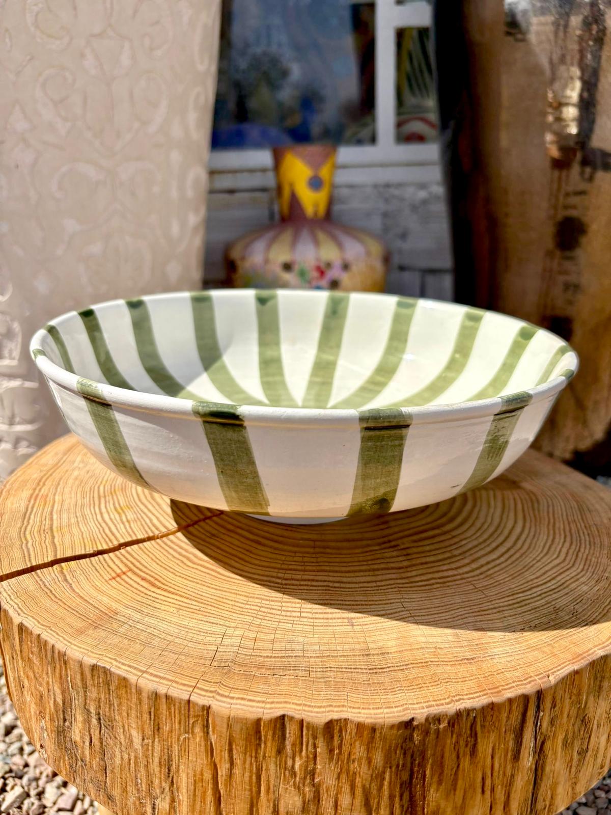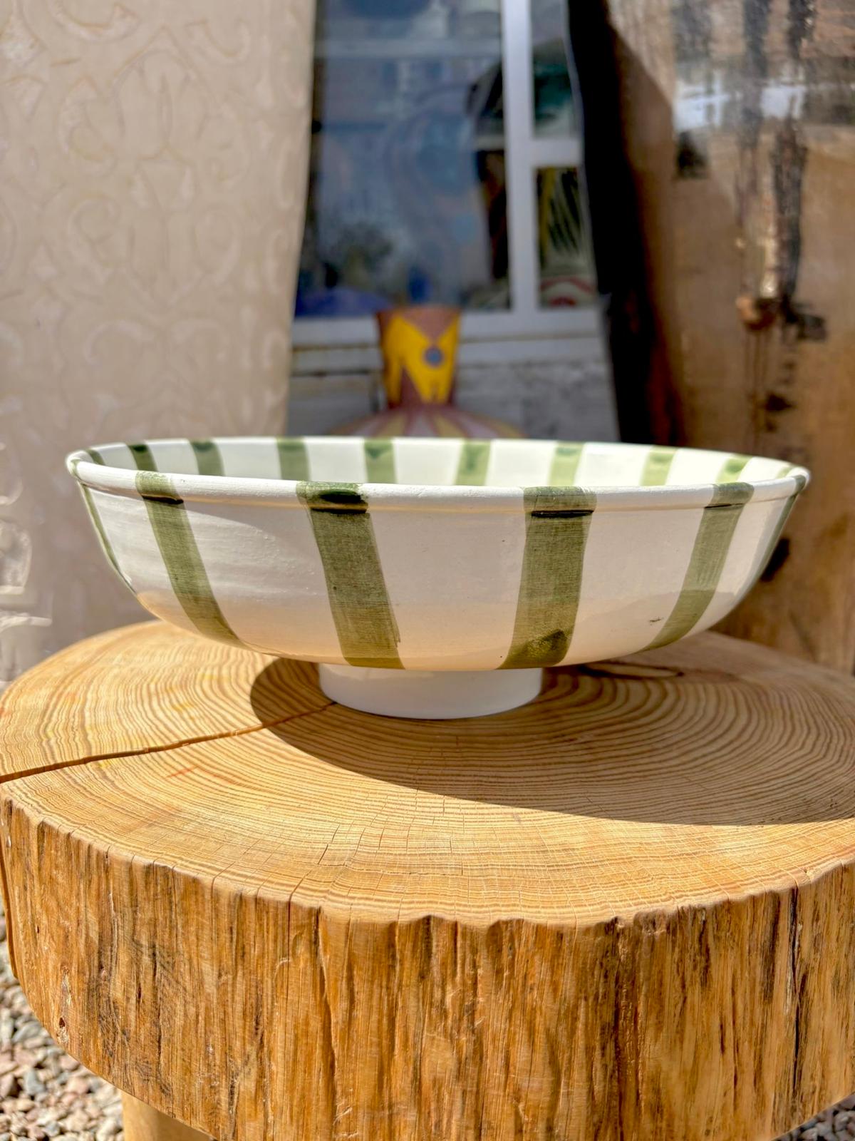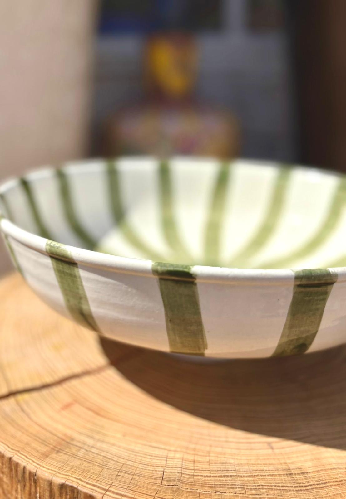 PLAT SALADIER ROND BLANC RAYÉ VERT FAIT MAIN
