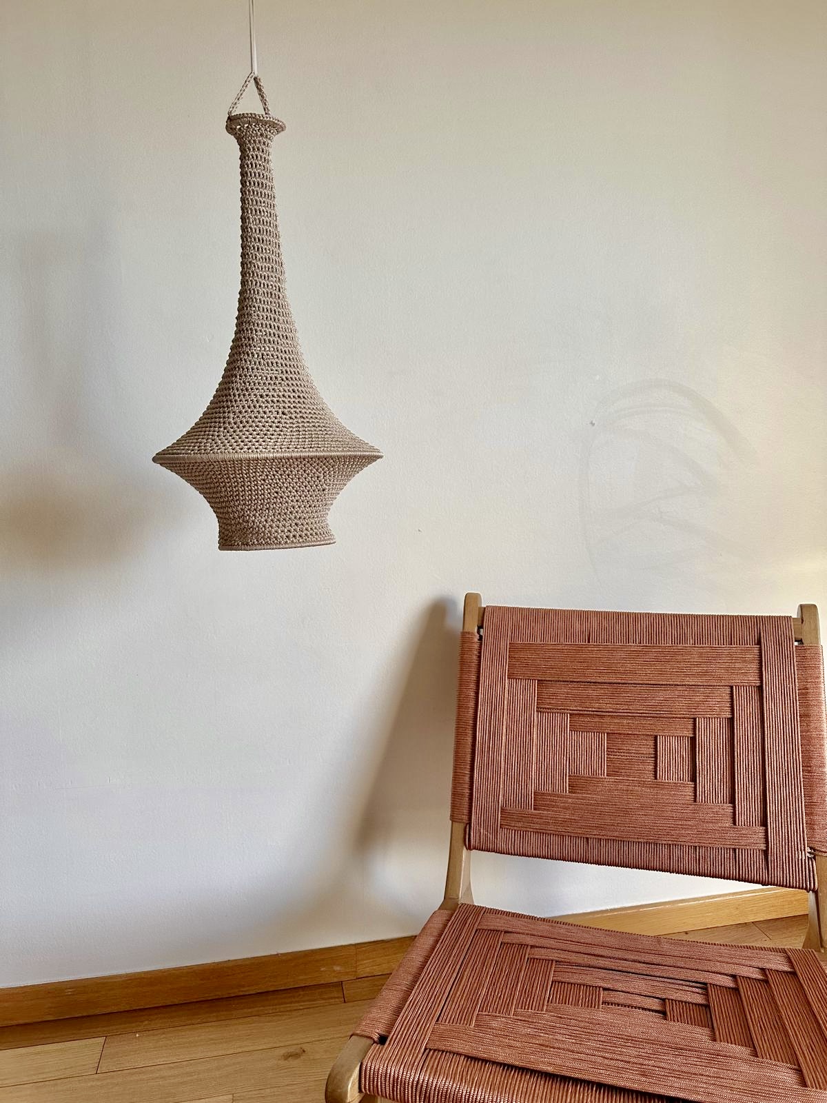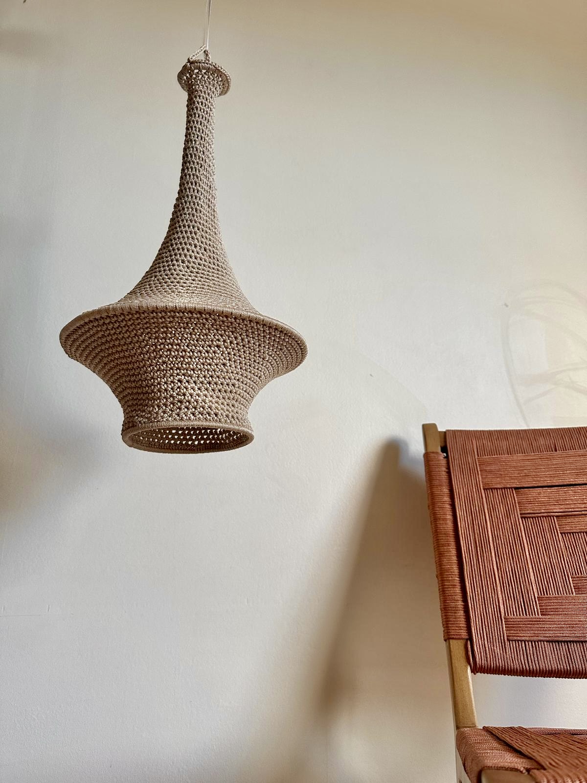 Cette magnifique suspension en crochet beige s’intégrera à merveille dans votre intérieur. Au-dessus de la table à manger, dans votre chambre ou en accumulation dans le salon, sa matière apportent un charme naturel à votre pièce. La forme permet de laisser passer la lumière.