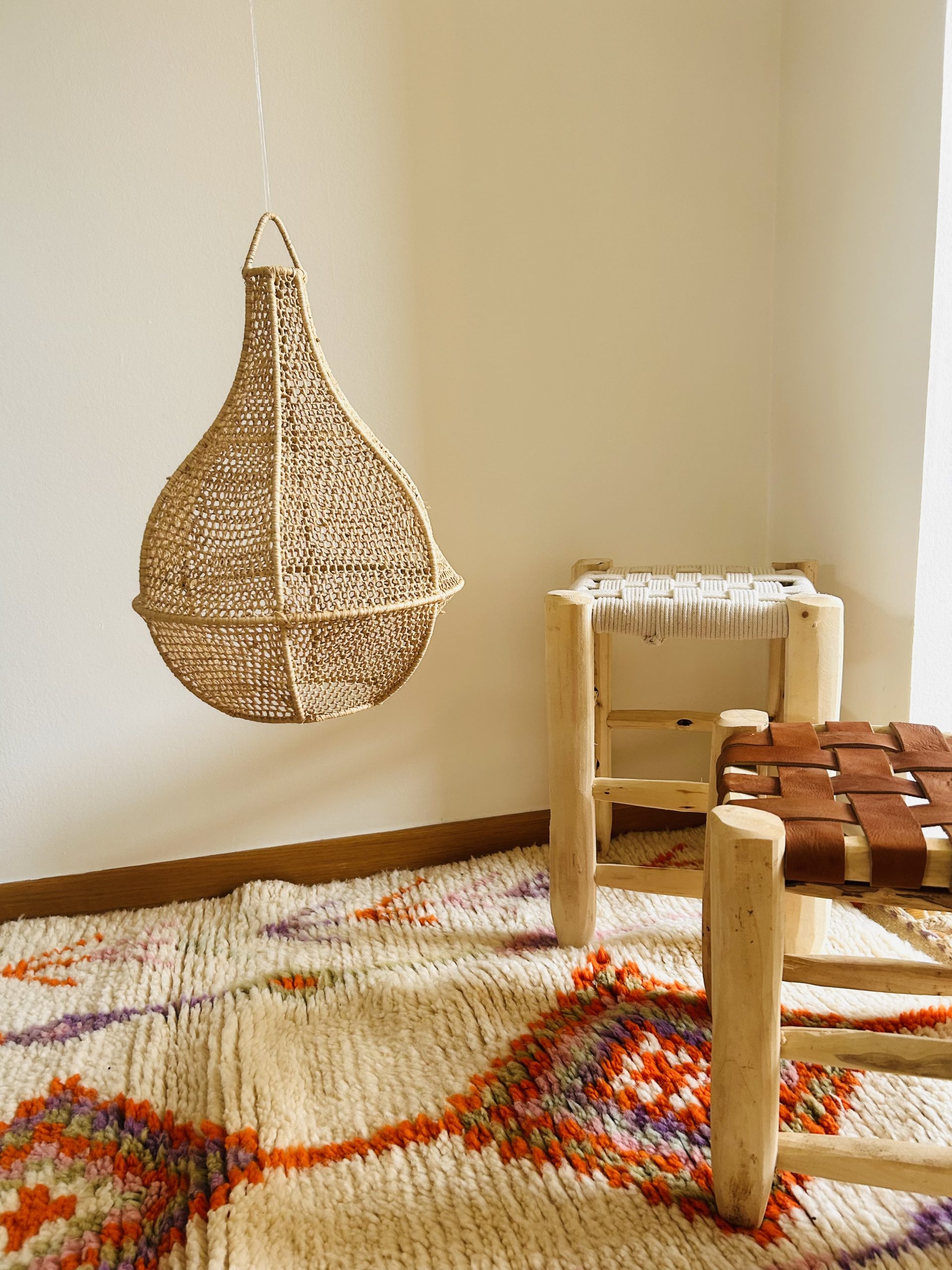 Créez une ambiance chaleureuse et authentique avec la suspension marocaine en dentelle de raphia, une pièce d’artisanat marocain au design artisanal et à la fabrication authentique. Réalisée à la main par des artisans du Maroc, chaque pièce unique révèle un art de vivre oriental empreint de tradition et de modernité.