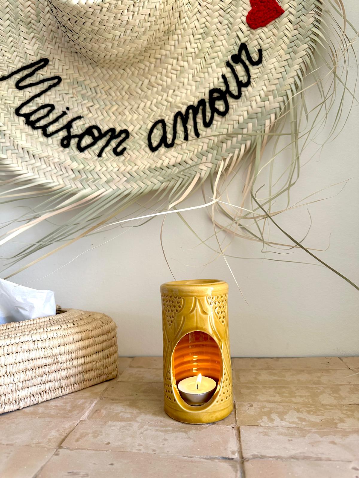 Découvrez notre diffuseur marocain à empreintes moutarde, fait main, pour créer une atmosphère apaisante et élégante chez vous !