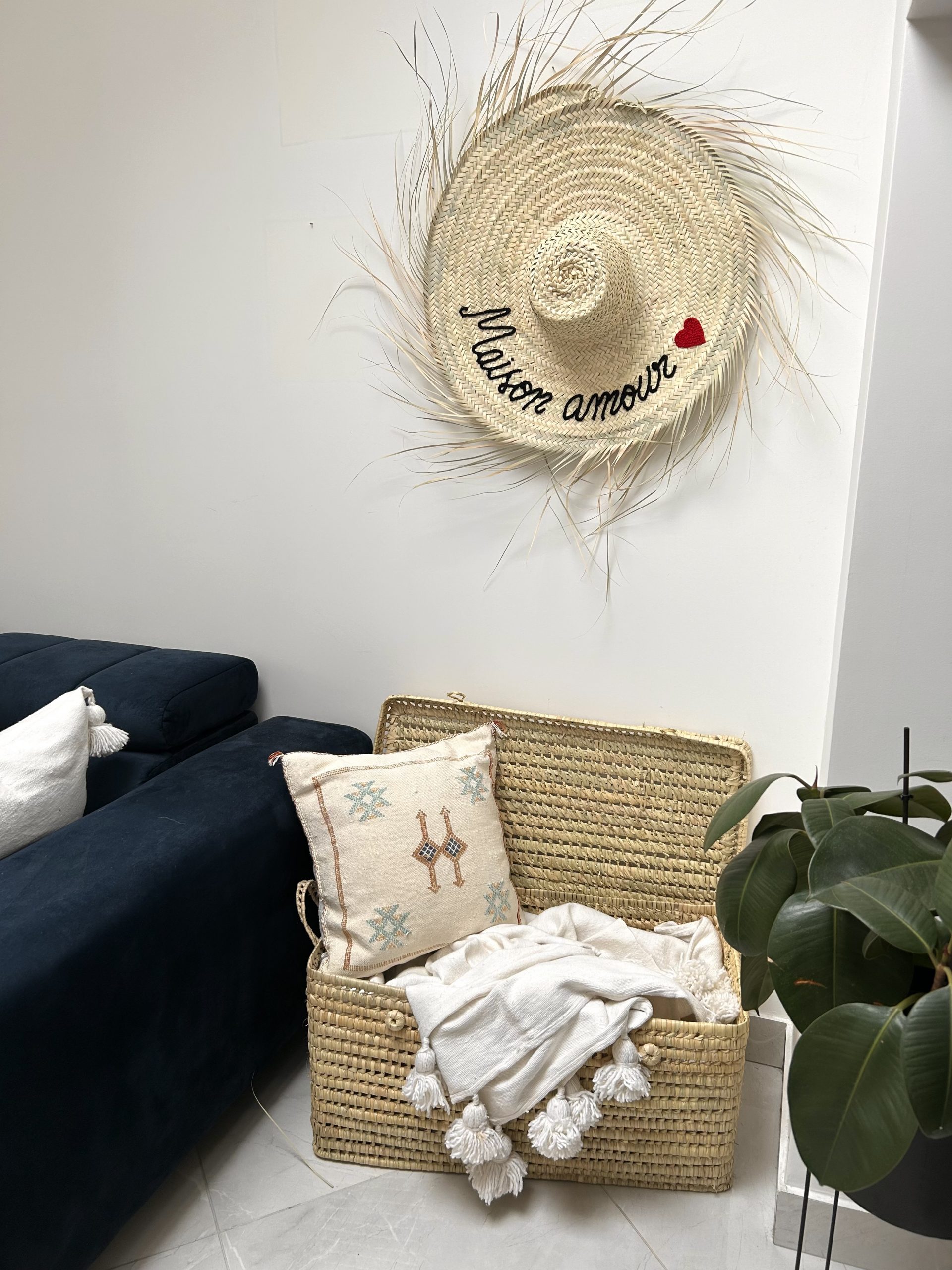 Apportez une touche bohème à votre intérieur avec notre grand chapeau en paille marocain, fait main et personnalisable !