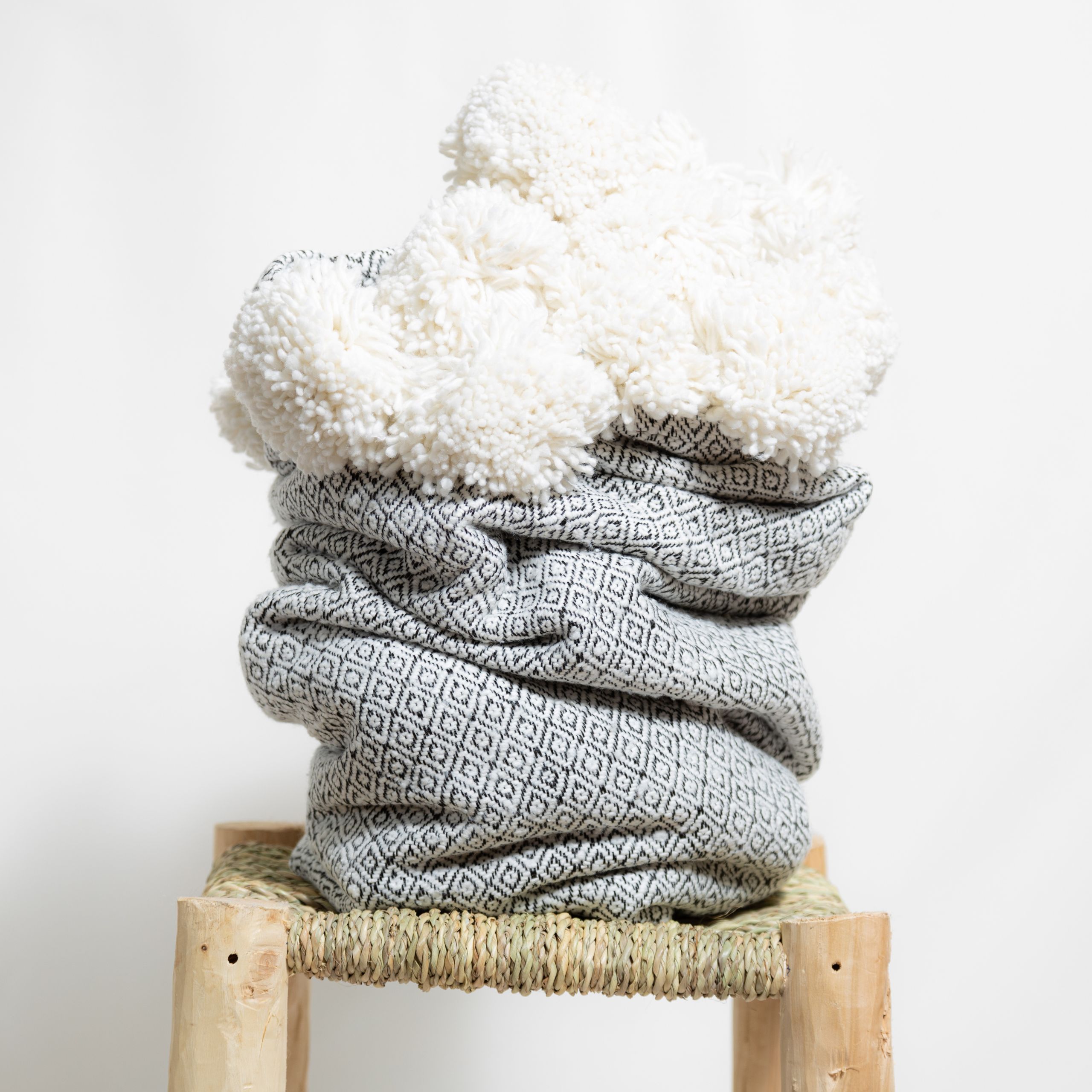 PLAID JETÉ DE LIT À POMPONS BLANC À MOTIF NOIR MODÈLE NAÏMA