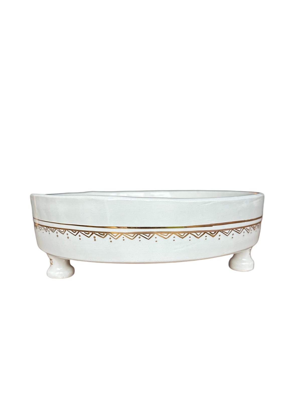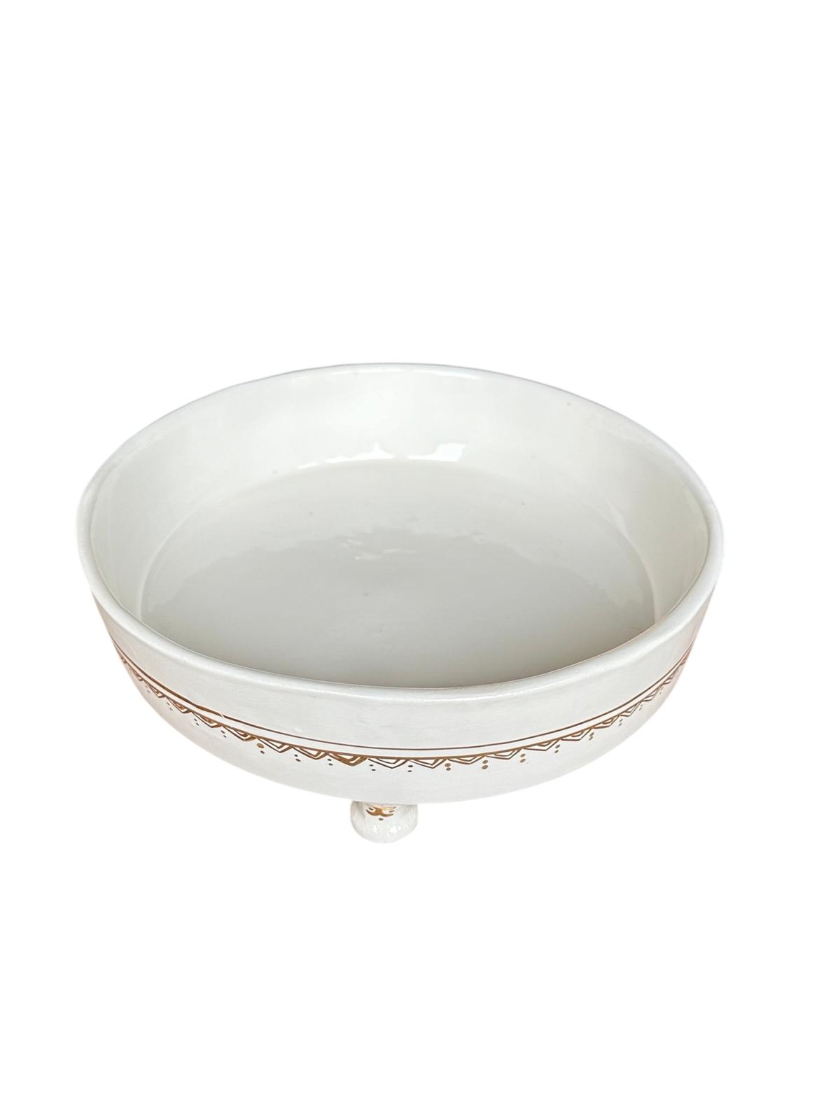 SALADIER PLATEAU ROND SUR PIED BLANC ET DORÉ EN CÉRAMIQUE