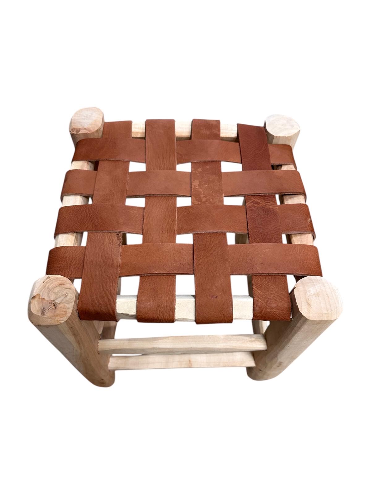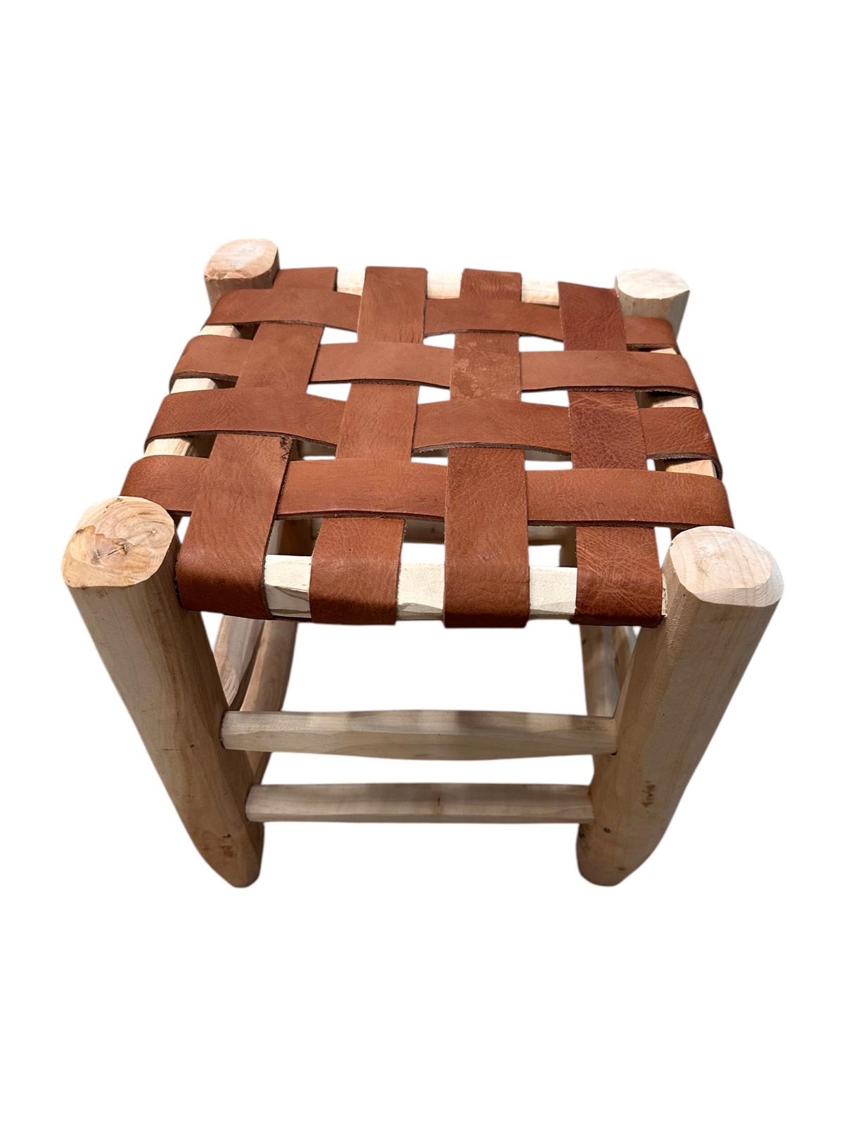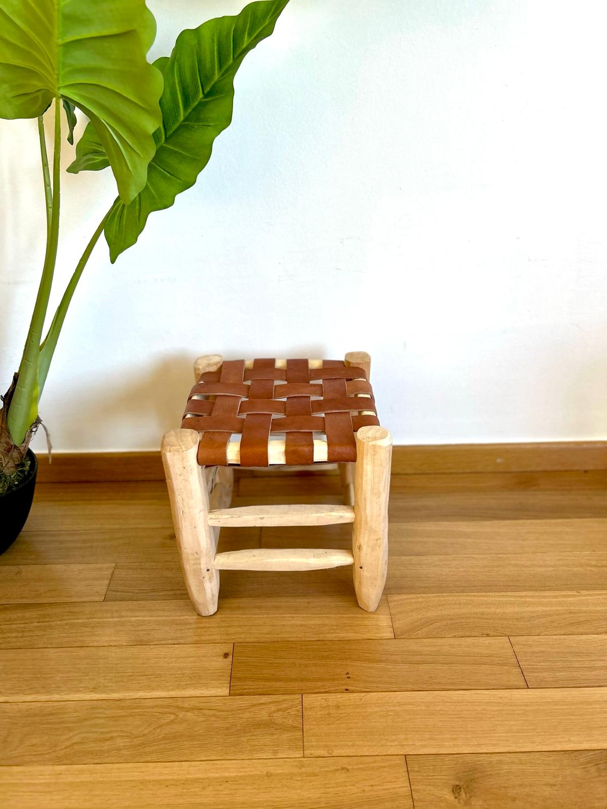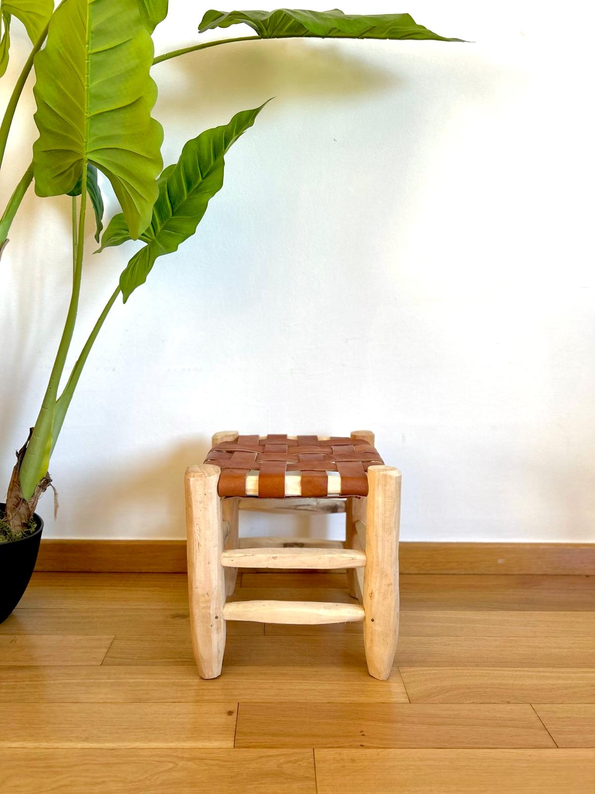 TABOURET EN CUIR MARRON ET BOIS NATUREL MODÈLE BEJAAD